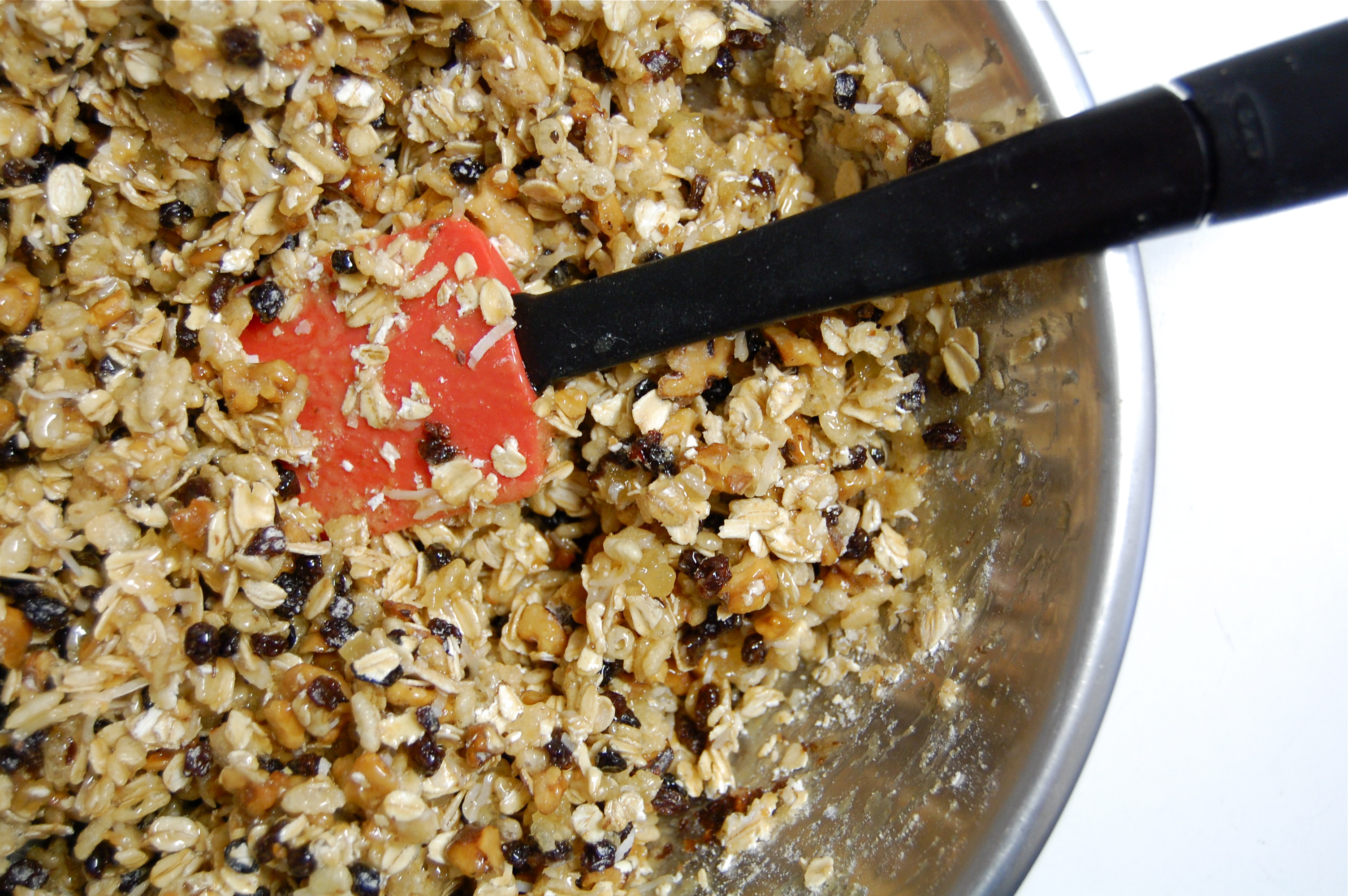 First you throw a bunch of stuff in a bowl: oats, walnuts, flour, cereal, currants, ginger and coconut. Toss them around to coat everything in the flour.