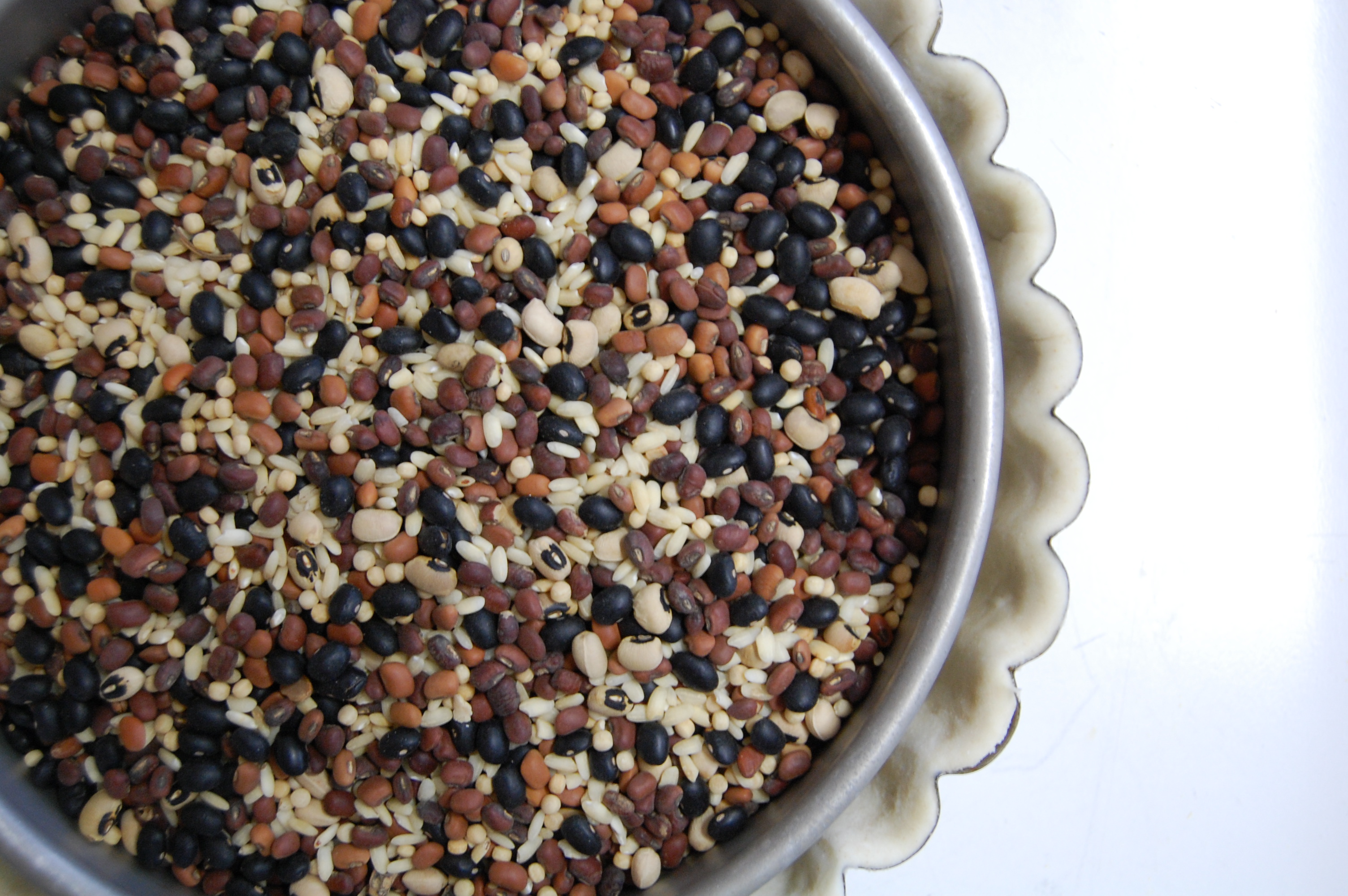 – Pull the pan out of freezer and place an 8″ round piece of parchment on top of the dough. It should fit neatly in the dough shell. Put an 8″ cake pan on top of the parchment. You should have just a little bit of space between the cake pan and the dough, because the dough will expand to hug the cake pan as it bakes. Fill the cake pan with beans. Then place something heavy on top of that (I use a round pizza stone). I know this seems excessive, but seriously that pie dough wants to puff up.