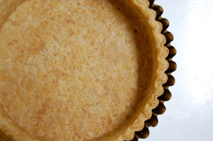 My pie dough falls in the middle. I use the 3:2:1 ratio, but I treat the dough like a quick puff. There are other techniques (I use this one when making galettes, because I don’t want such intense flakes there), but I like this one the best for pies. I also use a 9″ fluted quiche pan, because A) I don’t have the patience to shape beautiful edges and B) those beautiful shapes will melt out of a truly flakey dough anyways.