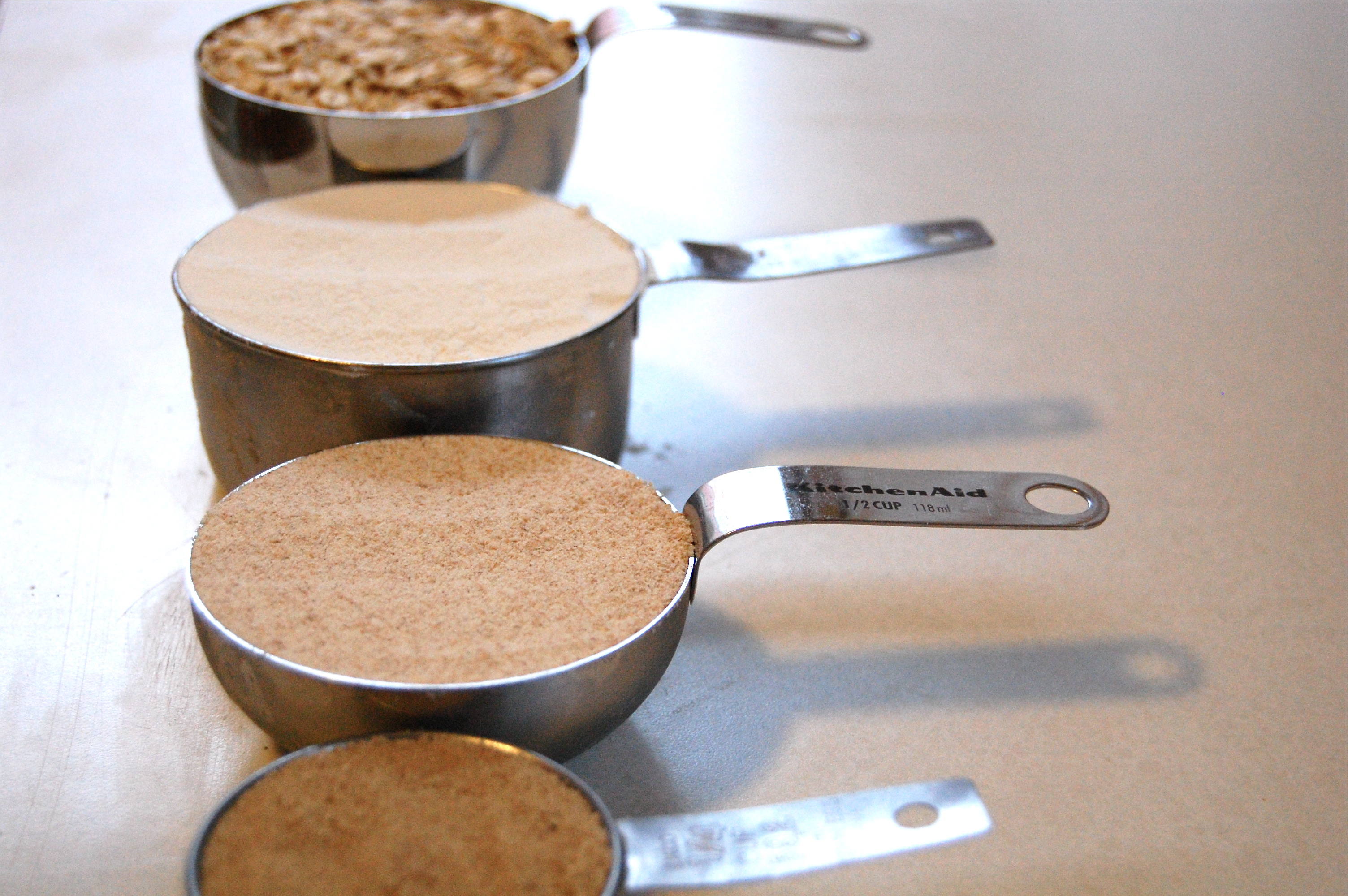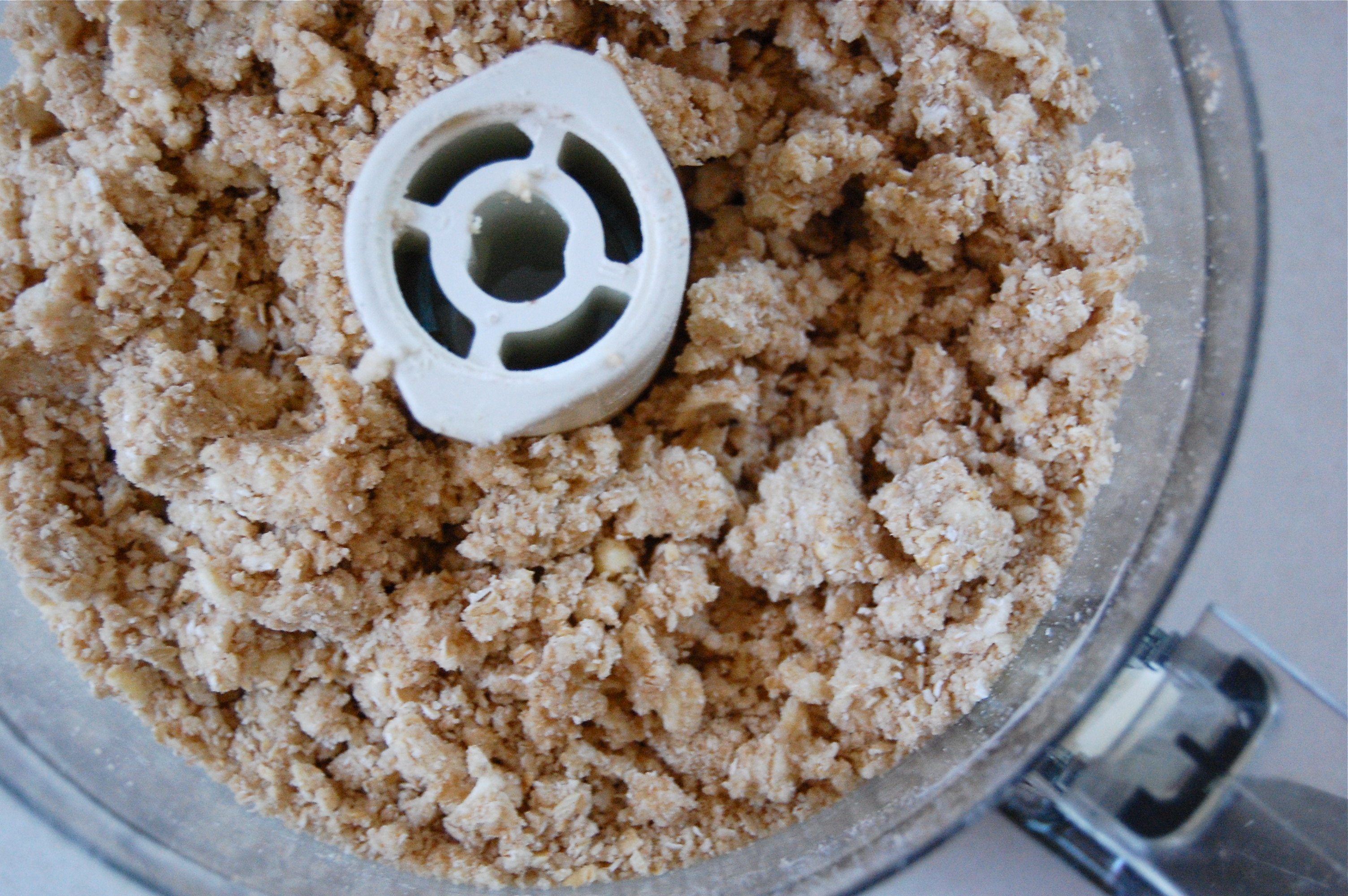 – Put the flours, brown sugar, and salt in a food processor and pulse until combined. Add half of the butter and pulse until the butter pieces are small and the dough looks crumbly, like coarse sand. Add the rolled oats and the rest of the butter in and pulse until the butter is mixed in, but still in decent sized chunks.