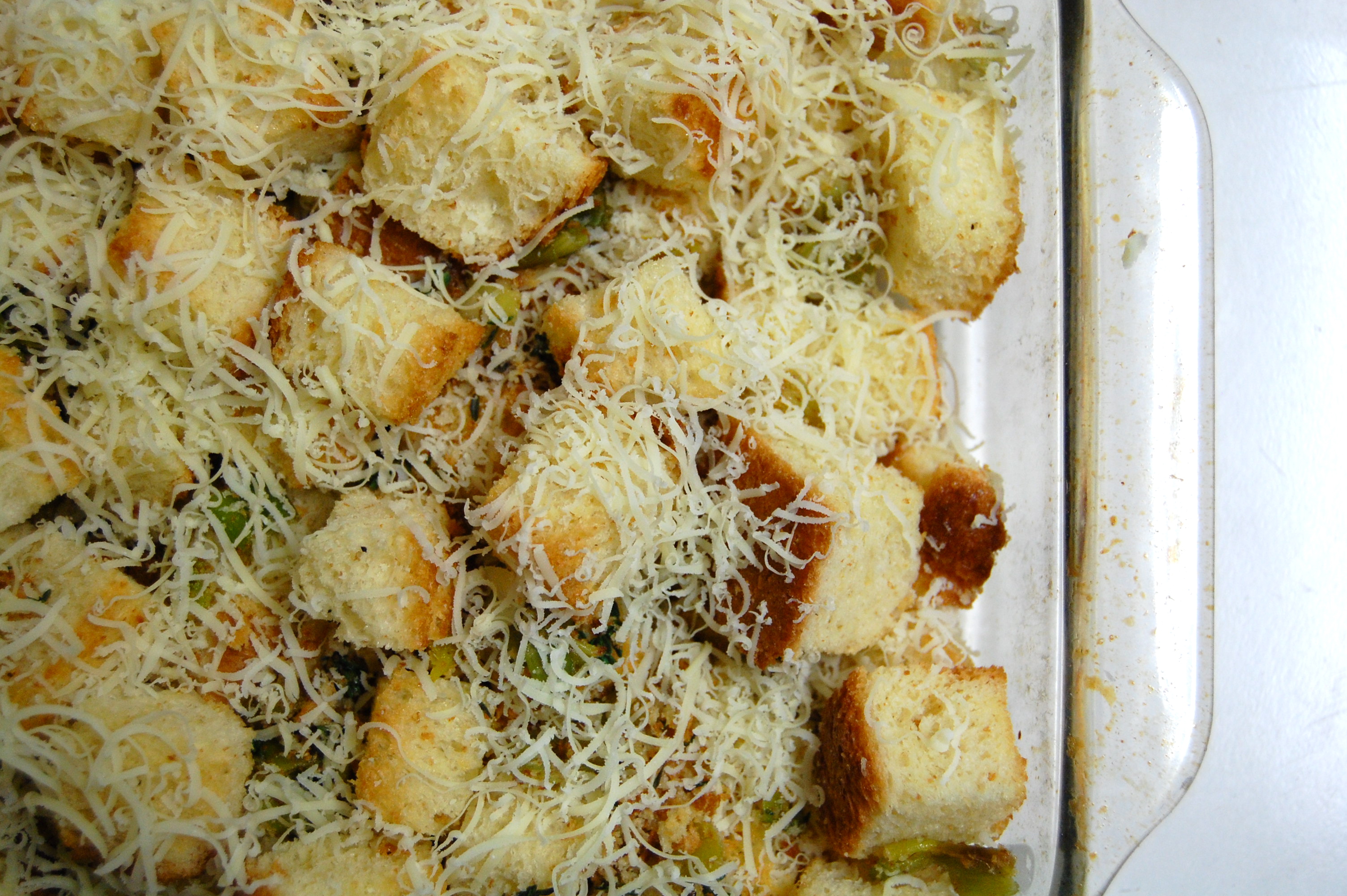 Then I layered a baking pan with the cheese, toasted brioche cubes, fresh thyme and the cooked leeks.