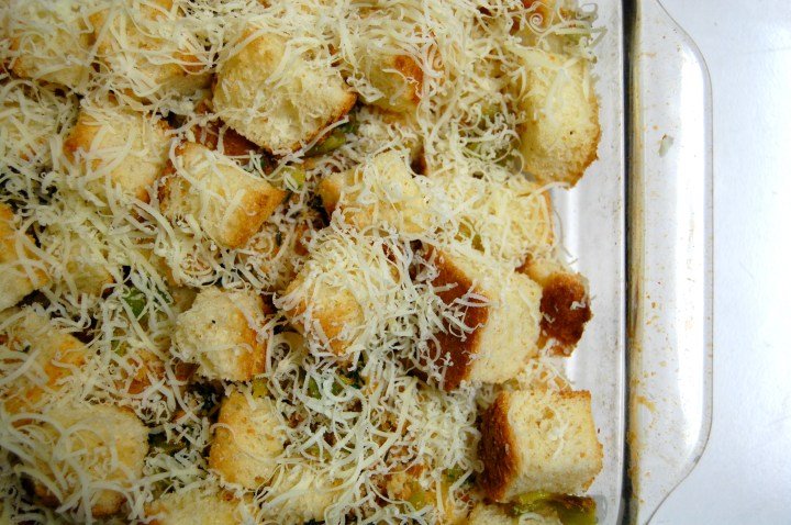 – Sprinkle 1/4 cup of the cheese in the bottom of a 9-by-13-inch baking pan. Spread half the leeks and croutons in the pan and sprinkle with another 1/4 cup cheese. Scatter the remaining leeks and croutons over and top with another 1/4 cup cheese. Pour in enough of the custard mixture to cover the bread and press gently on the bread so it soaks in the milk. Let soak for about 15 minutes.