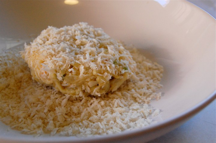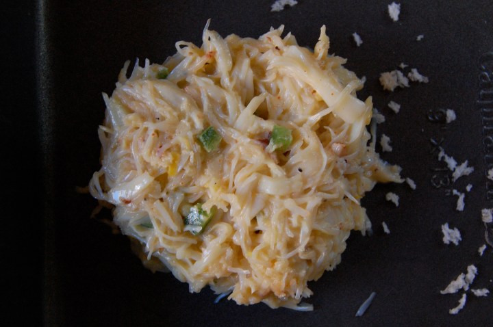 I wanted a light crab cake, without a lot of bread filler so the crab flavor comes through. I tossed the meat with garlic, lemon, jalapeno, dijon, mayonnaise, egg yolks, salt, pepper and cayenne.