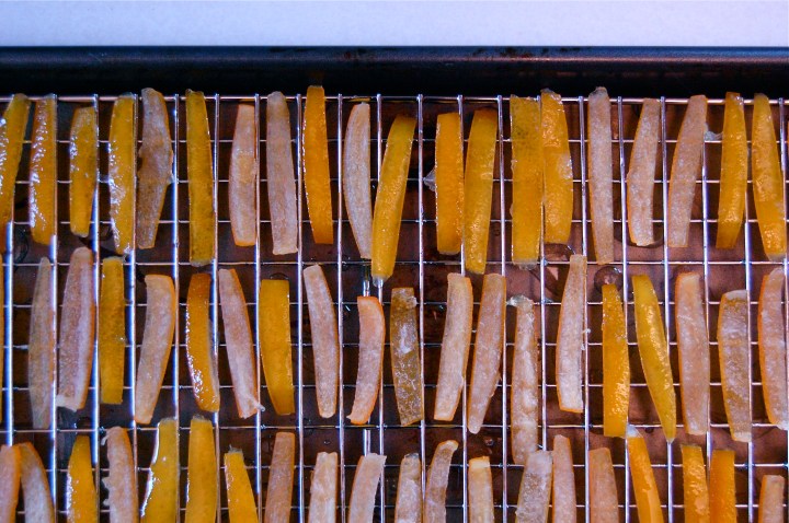 You see, tucked away in my brain’s recesses was a desire to perfect the technique of candying citrus. I know it’s not exactly hard, but I seem to have a very high standard. I dream of these perfect little gummy peels, flexible and soft, evenly coated with sugar, chewy when you bite into them, and not a trace of bitterness. For something that only has 3 ingredients, I had a hard time finding a way to consistently get perfect candy. But after about 5 rounds with the peels (that would be 5 weeks worth of budino scraps), I am proud to report that I’ve finally got it. What I think is the perfect technique for candied citrus.