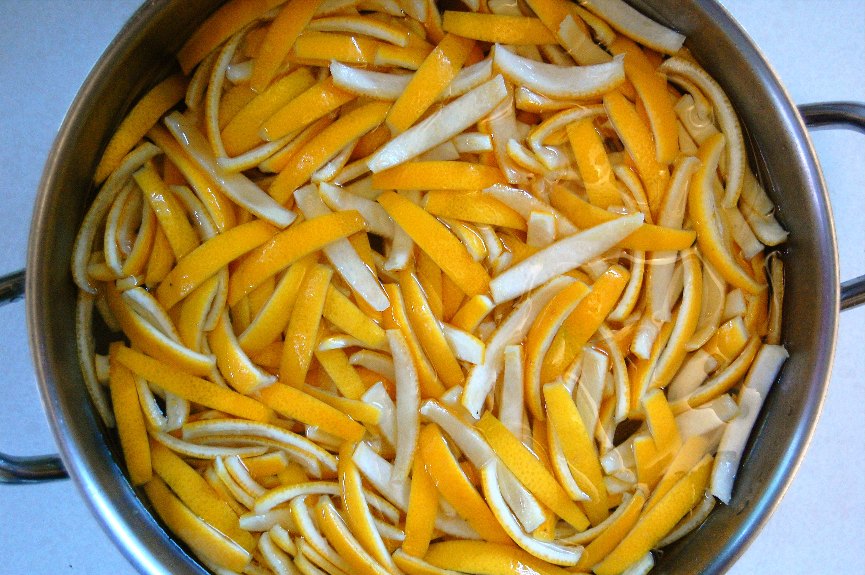 First I sliced up my peels to the ideal size. Then I placed them in cold water and brought that to a boil. As soon as the water boiled, I drained them out. I did this 3 times, rinsing the heat out of the peels between each blanch so that they always started in cold water (without rinsing they will warm the water up immediately). This step helps remove the bitterness from the remaining pith.