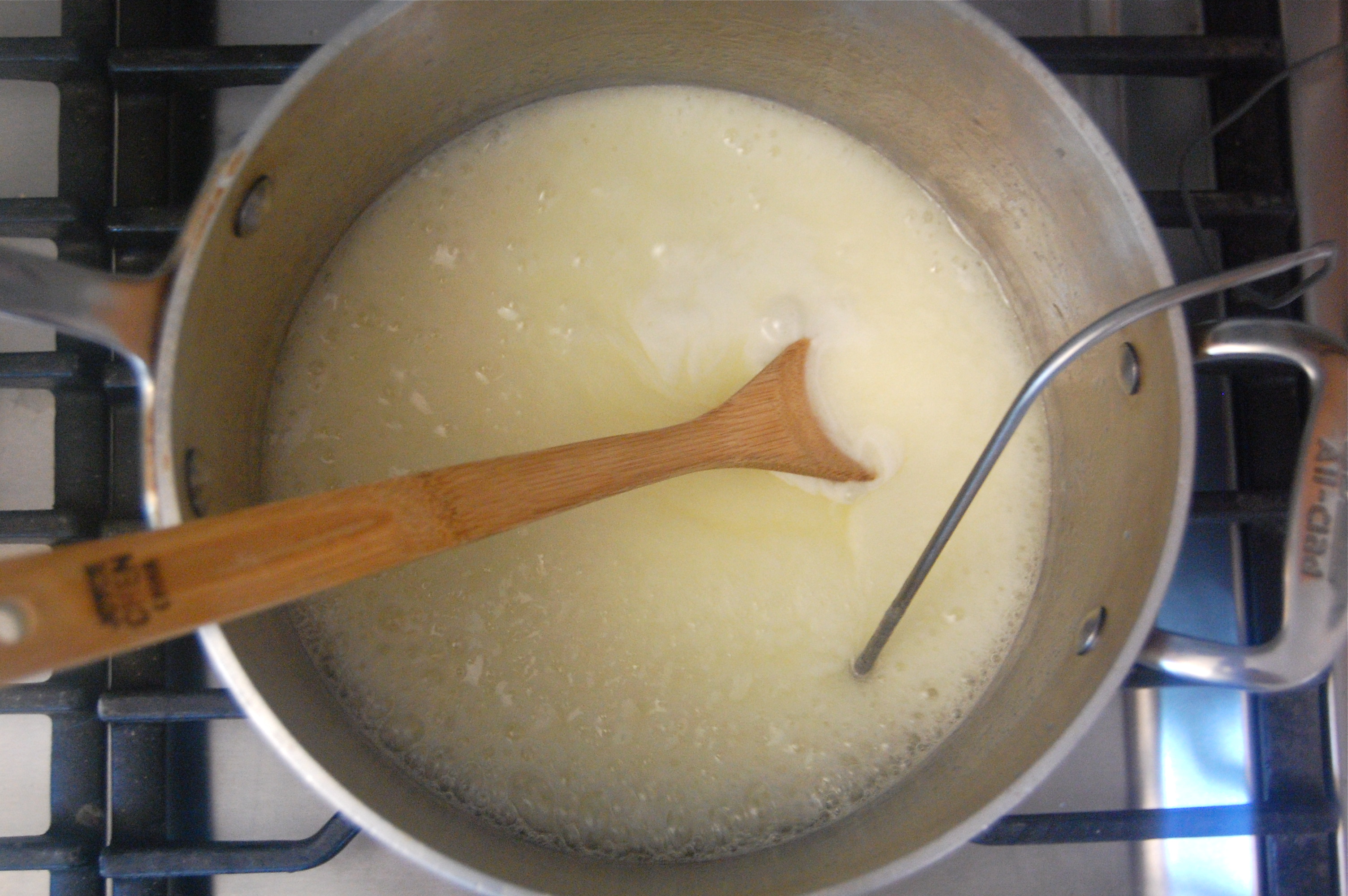 While that was warming I heated up butter, sugar, corn syrup, milk, vanilla bean seeds and salt. This started out easy enough, but it was a tad tricky getting it up to 300 degrees without it burning in spots. There was a lot of stirring involved. I would have taken pictures, but I unfortunately only have 2 hands.