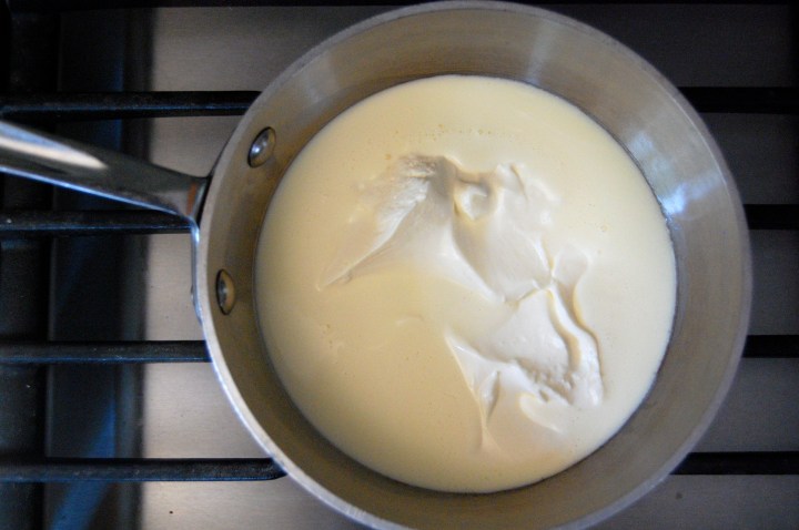 – Put creme fraiche in small saucepan over low heat. You want it all loose and melty, not boiling.
