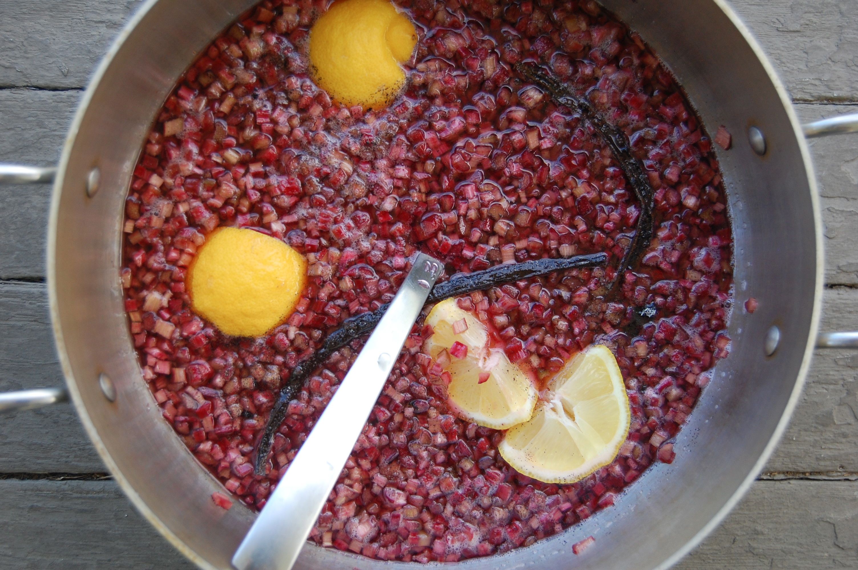 I started by chopping up the rhubarb into teeny tiny bits. Like 1/8″ big bits. I rubbed the vanilla bean seeds into the sugar, and mixed the vanilla sugar (pod included) into the chopped rhubarb. I squeezed in the lemon juice and threw in the whole lemon chunks, which supplied some much needed pectin. I let the whole pile sit overnight in the fridge to get the juices out of the rhubarb.