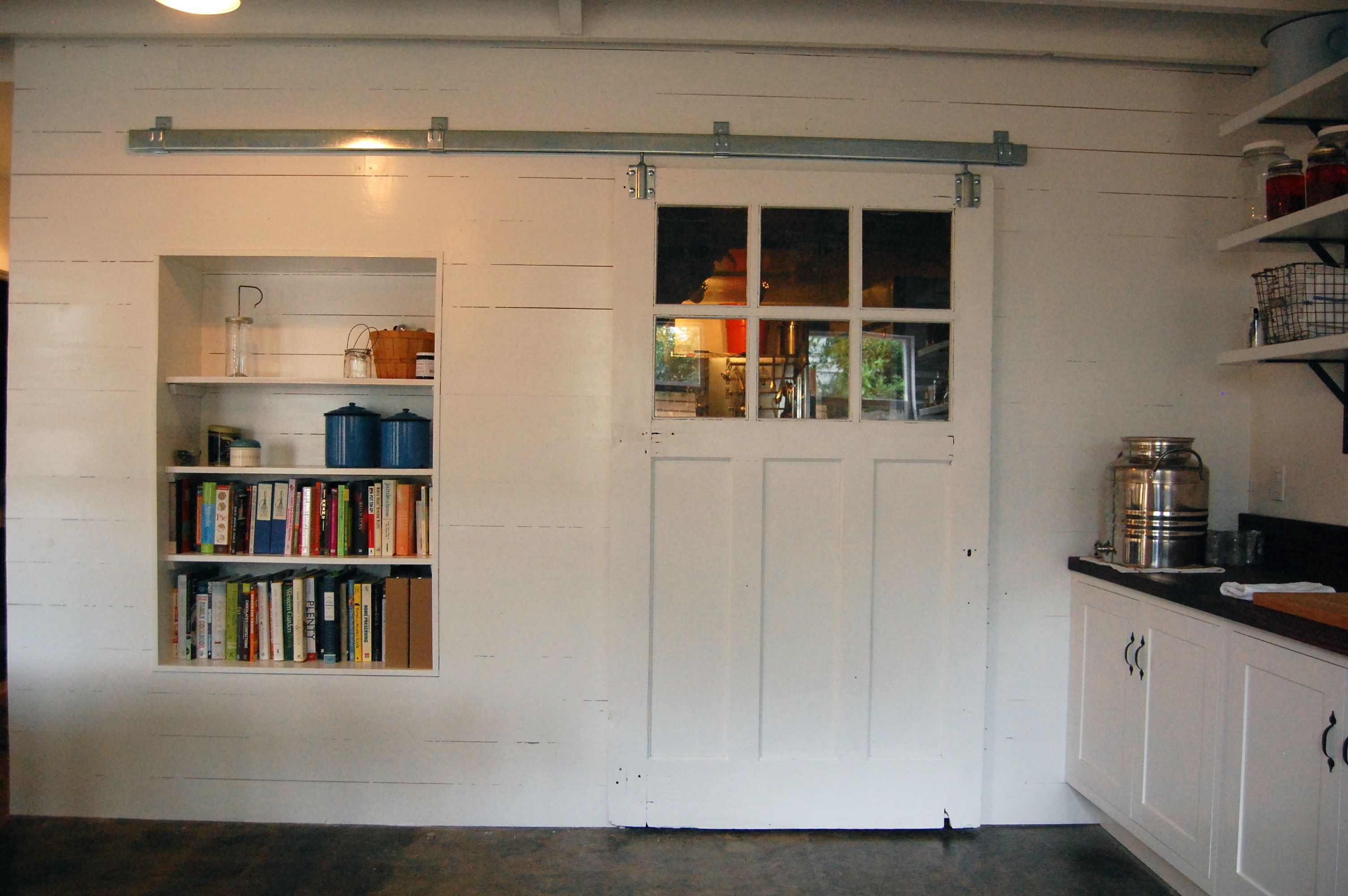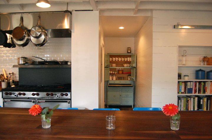 We had a rule of trying to find as many of our materials as possible used, from architectural salvage stores. On one of our early visits, in the dark days of winter, we came across a door. It looked like it would fall into pieces if you looked at it wrong. And according to our friend and carpenter Joe, who fixed it, it did. But it was $10 and we just had to have it. Between that door and the beautiful ceiling we were exposing, the space just started designing itself. It was to be a commercial kitchen, so there were… rules, but I really wanted it to feel like home. A place where people could feel comfortable just stopping by to say hello. Where after a class or dinner, people would want to linger. A place where a community is built.