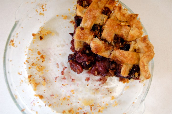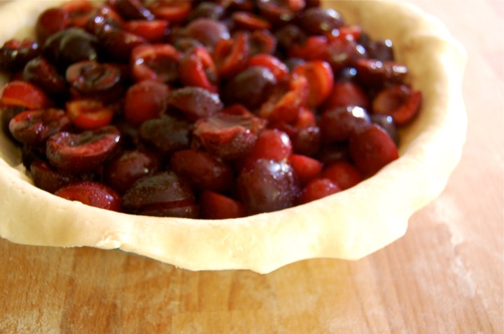 And so it begins. I know, we’re a bit late, but fruit has finally arrived in the Pacific Northwest. Every year I await with relish the first bloodbath of cherry pitting. Somehow I always forget just how messy it gets and stain everyone and everything within arm’s length of the kitchen. But having my kitchen look like a killing floor is a small price to pay when you’re fruit-starved in June. A visit to the Ballard farmer’s market left me carrying 3 lbs of local cherries (along with some of the teeny-tiniest sweetest little strawberries!) and I was determined to make pie. Because, well, it has just been too long.