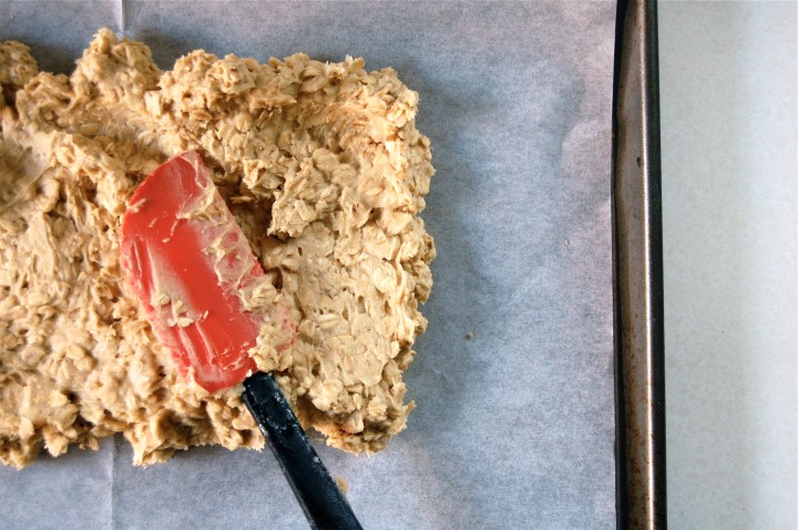 The crust. The crust is so much fun. It starts with a pretty straightforward oatmeal cookie dough. You press it into a sheet pan until it’s pretty thin. I actually found it a bit sticky to work with and ended up rolling it between parchment sheets.