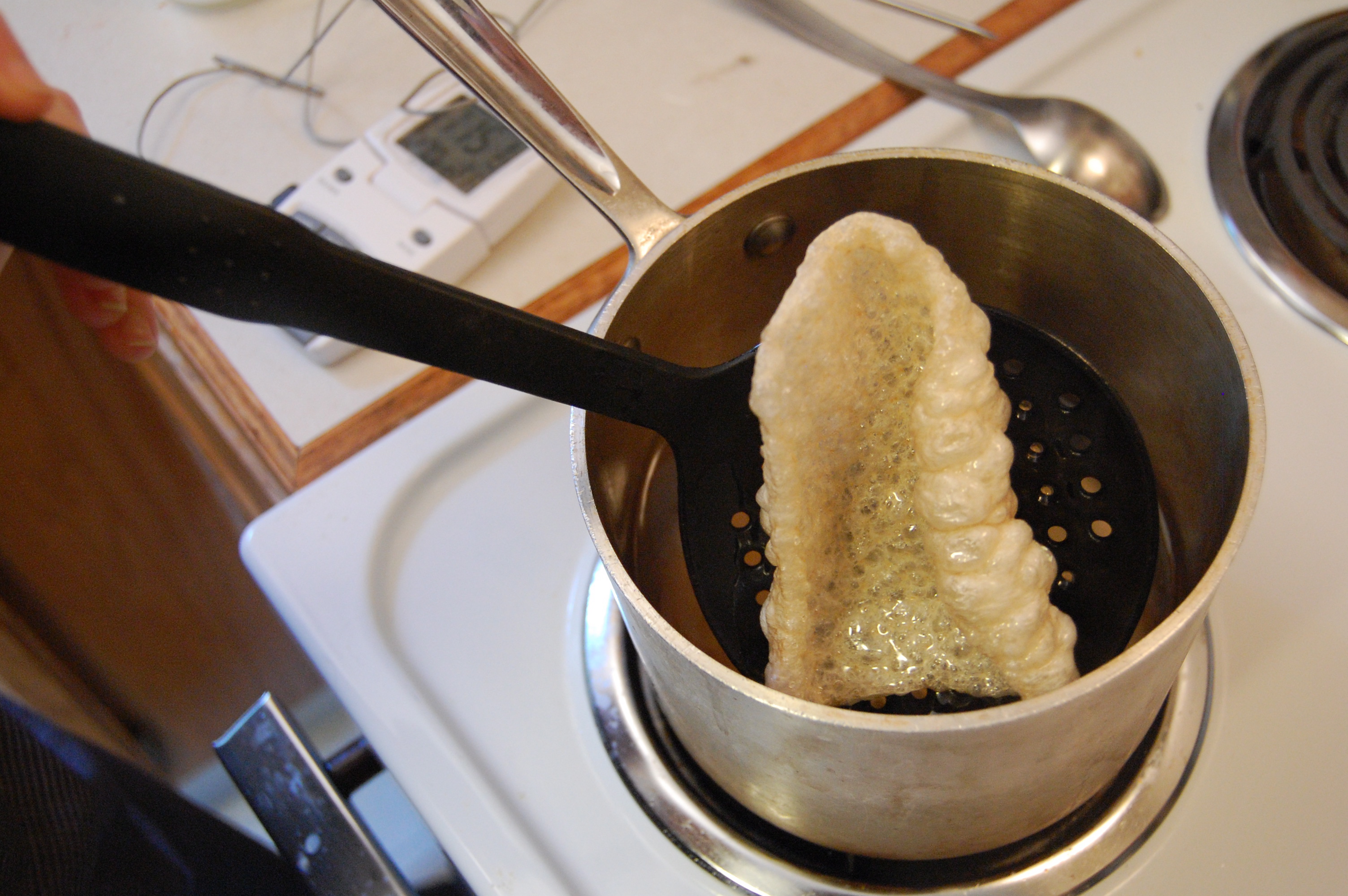 I heated your lard to 390 degrees and tossed in your skin, one piece at a time.
