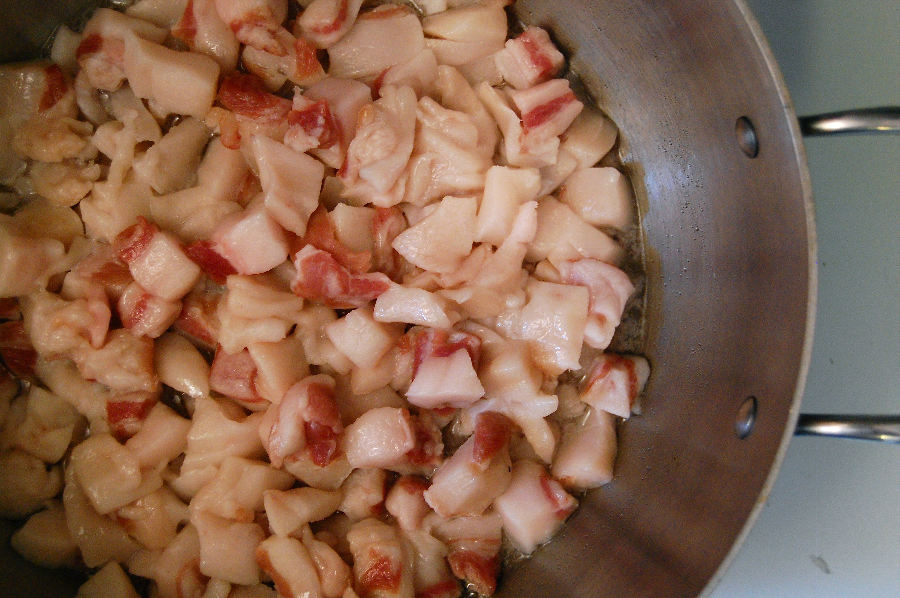 You did it again. You made me fall in love with you all over. It started months ago, you see. Living in San Francisco. There was this guy, Ryan Farr his name was. He was making magic with pork skin, and his chicharrones were showing up all over town. I was deeply jealous. I hated him for knowing you in a way that I didn’t. I mean, I grew up in ALABAMA – I should be frying pig skin in my SLEEP! Why wasn’t I grandfathered in on the secret? And rumor had it that this Mr. Farr was taking his technique with him to his grave. So I was on my own to find my way into your heart/skin. All hope was seemingly lost, months of searching were fruitless. But then it happened. I read somewhere that the new Momofuku cookbook was spilling the beans. Step by step directions for perfect chicharrones. I ordered some fatback from my new favorite butcher shop and left the house 5 minutes later to buy a copy. There was no stopping me now.