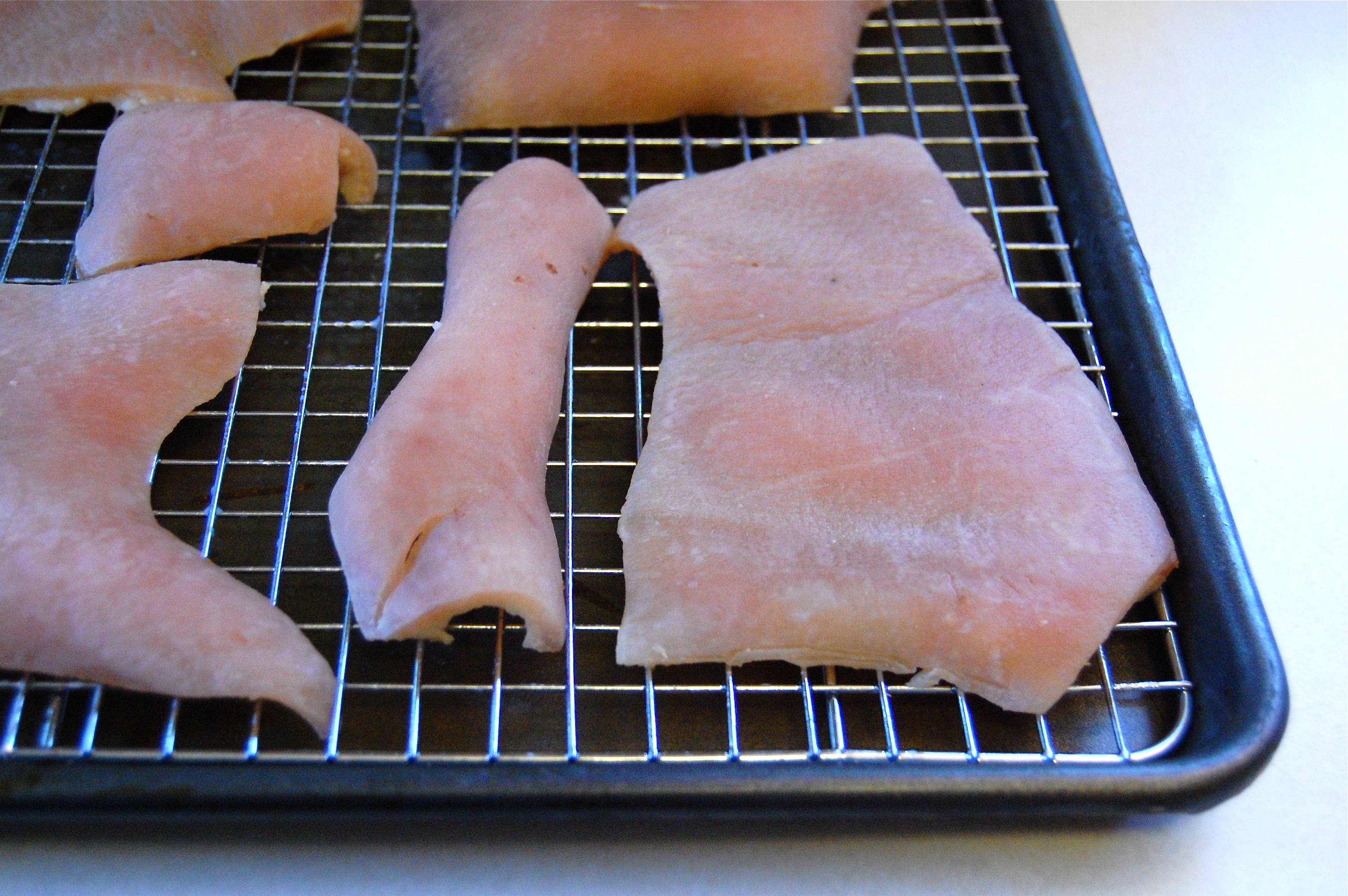After your skin was done boiling, I stretched you out and placed you in the fridge. There you chilled for another 2 hours. Then I set about the arduous task of scraping off every last bit of fat. The book recommended the side of a spoon, but I had to use a knife. Because this was OUR moment and I wanted you to be perfect. Then I popped you in the dehydrator and let you do your thing overnight.