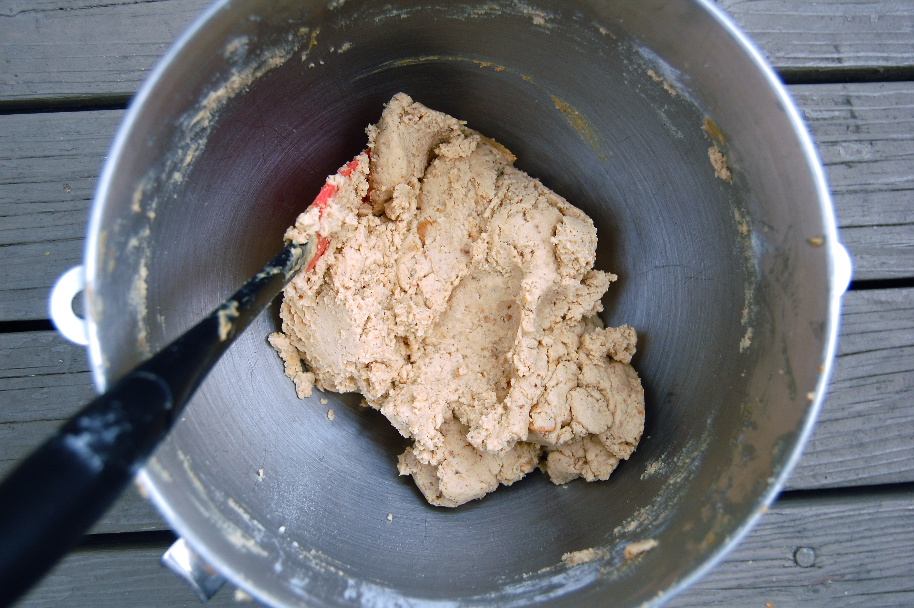 – In a stand mixer, cream the butter on medium speed for a minute with the paddle attachment. Slowly pour in the sugars and continue creaming until the mixture is light and fluffy, scraping down the sides of the bowl as needed. Add the peanut butter and mix just until combined. Lower the speed and add the chilled oats, mixing until just combined.Turn off the mixer and add the flour mixture. Mix on low speed until the dough comes together in a ball.